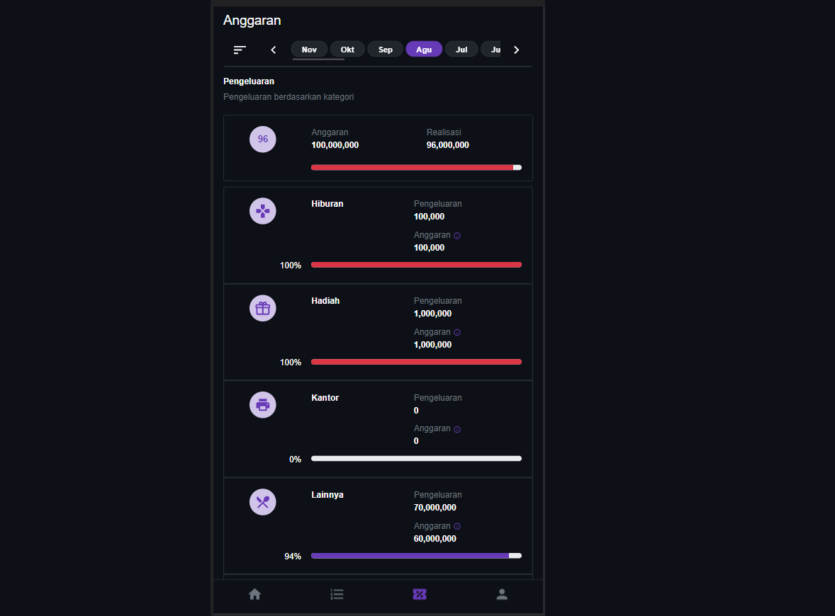Saya juga menambahkan mode Budgeting dimana saya bisa mencatat berapa batas yang boleh saya habiskan pada suatu bulan. Fitur ini berguna supaya saya bisa melihat sisa uang yang bisa saya pakai pada suatu kategori dengan anggaran yang sudah saya buat diawal.