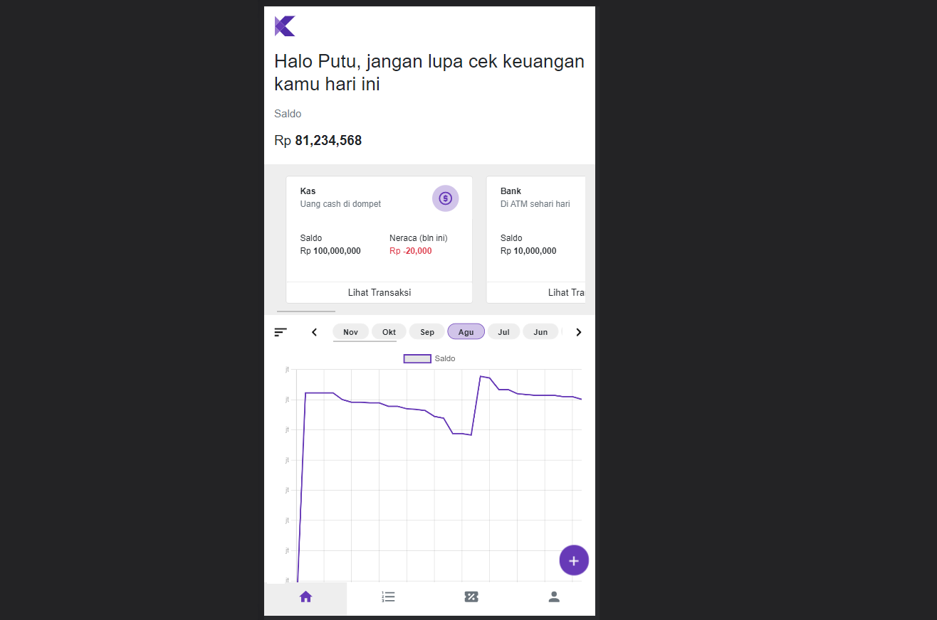Aplikasi keuangan memiliki fitur utama seperti pada aplikasi keuangan pada umumnya, yaitu pencatatan, CRUD (create, read, update, delete) dan visualisasi data. Namun, aplikasi ini sudah dilengkapi sesuai dengan kebutuhan saya.